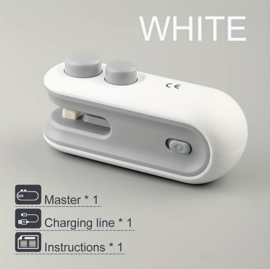 Featuring a modern white design, this durable mini sealer includes a magnetic back for easy fridge storage and a charging cable for USB-powered convenience. Lightweight, portable, and easy to use, it's the ultimate solution for reducing food waste and organizing your kitchen or workspace.